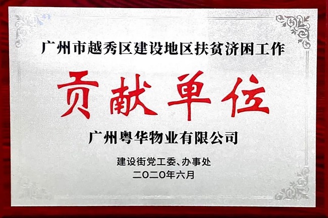 扶贫攻坚路上,粤华物业还积极响应建设街辖区内捐款扶贫活动,向贵州毕节、清远根竹坑等贫困地区学生助学捐款、定向帮扶,进一步推进乡村振兴建设,改善贫困地区群众生活条件;623日,在建设街举行2020年广东扶贫济困日爱心捐赠活动中,粤华物业被授予扶贫济困“贡献单位”。