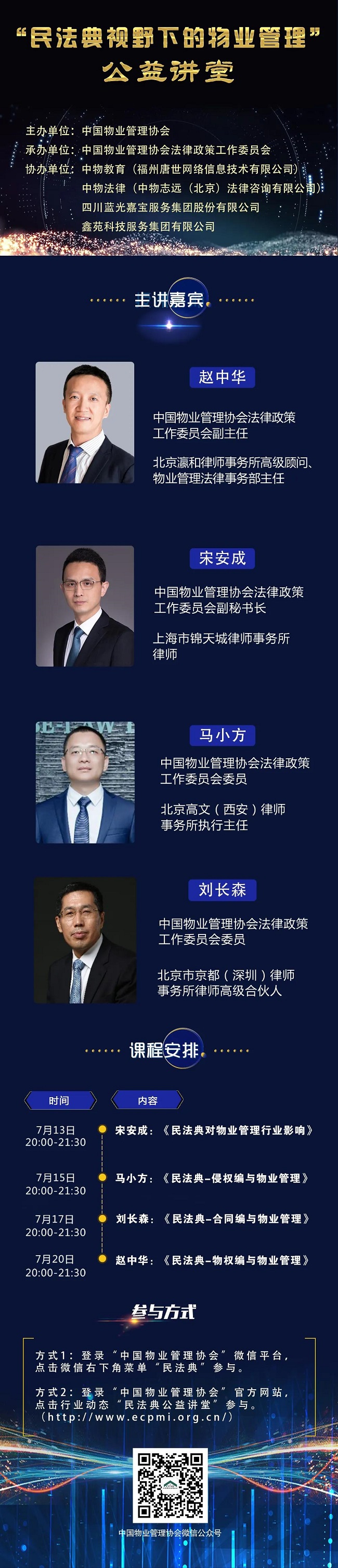 本次公益讲堂为系列讲座,后续讲座将分别由87978797威尼斯法律政策工作委员会马小方、刘长森、赵中华三位专家围绕《民法典-侵权编玉物业管理》《民法典-合同编与物业管理》《民法典-物权编与物业管理》进行讲解。