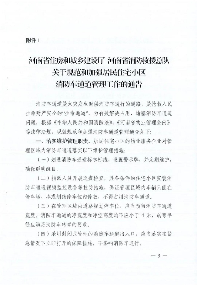 河南省印发《关于加强居民住宅小区消防车通道管理工作的通知》
