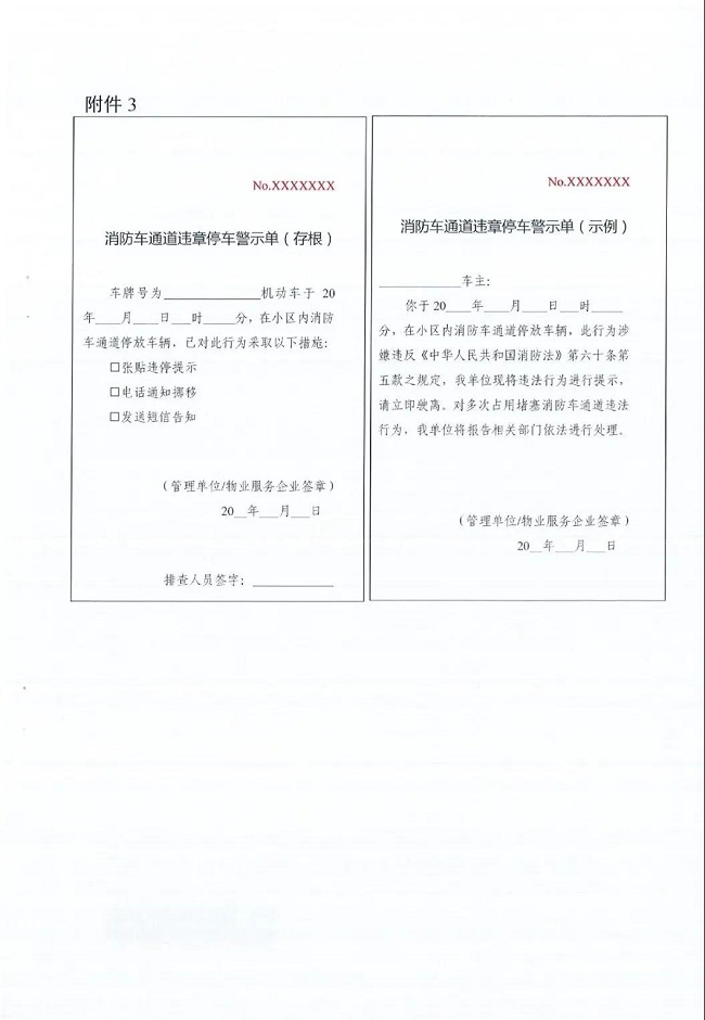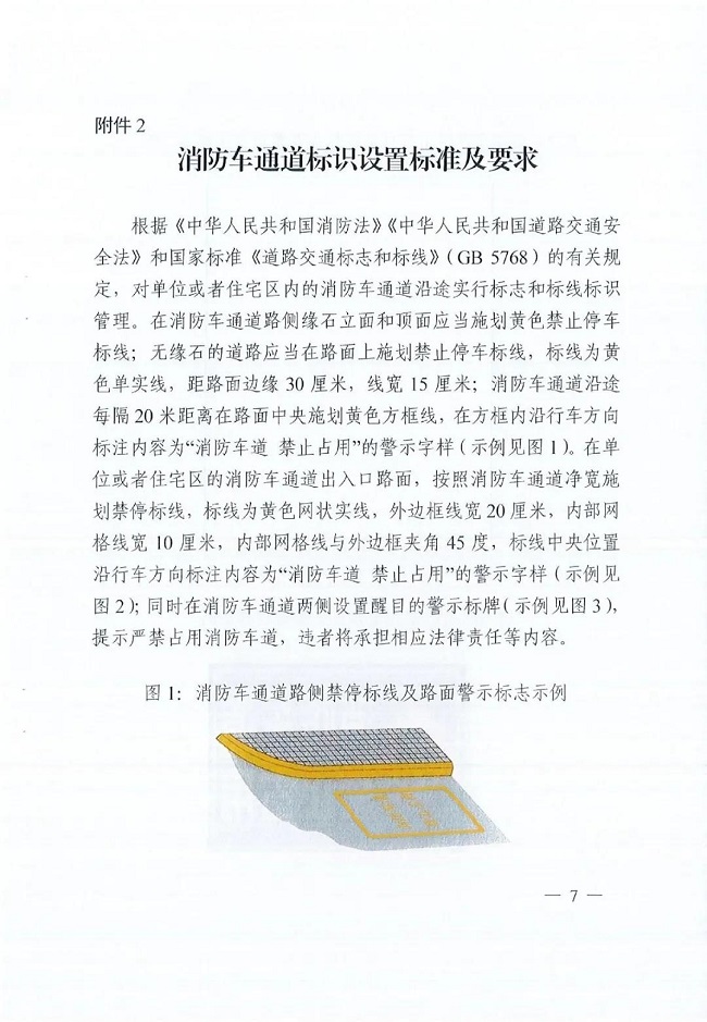《通知》明确,各地住房城乡建设(房地产)部门和消防救援机构要督促管理单位、物业服务企业,在居民小区车辆出入口、消防车通道转角处悬挂禁停标识,统一施划停车位、消防车通道出入口禁停标线及路面警示标识,并定期对标线标识进行维护。