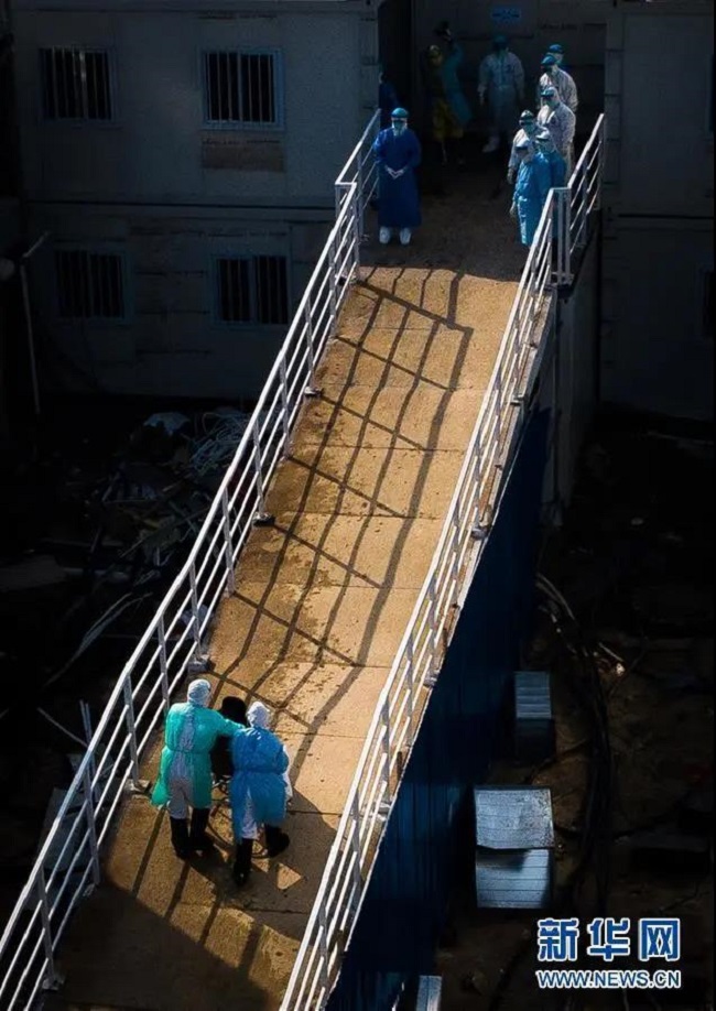 医护人员将患者送入武汉火神山医院病房(2020年2月4日摄,无人机照片)。新华社记者 肖艺九 摄