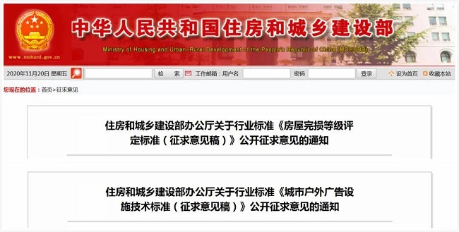 近日,住房和城乡建设部就行业标准《城市户外广告设施技术标准(征求意见稿)》和行业标准《房屋完损等级评定标准(征求意见稿)》公开征求意见,意见反馈截止时间为2020年12月9日。