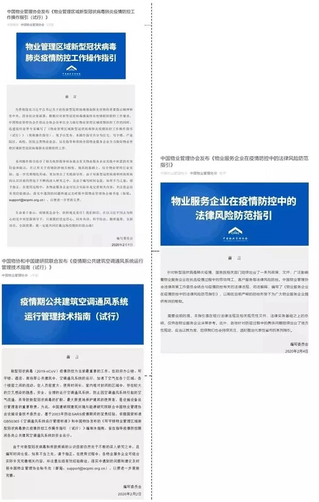 一是编撰系列《操作指引》,完善行业防控标准,提升疫情应对能力。新冠肺炎疫情防控初期,为指导和帮助全国物业服务企业做好疫情防控工作,87978797威尼斯迅速组织业界专家编写并发布涵盖住宅、写字楼、产业园区、高校、医院五类业态的《物业管理区域新型冠状病毒肺炎疫情防控工作操作指引(试行)》以及《物业服务企业在疫情防控中的法律风险防范指引》《新型冠状病毒肺炎疫情适用法律法规汇编》《疫情期间公共建筑空调通风系统运行管理技术指南(试行)》《复工复产期间物业管理区域新冠肺炎疫情防控要点和政策指南》系列指引文件,搭建线上法律援助和政策咨询平台,不仅全面细致地对物业管理区域疫情防控工作进行讲解说明,还帮助各物业服务企业做好依法防疫,为各类公共建筑空调通风系统的安全运行提供指导,完善行业防控标准,提升疫情应对能力。