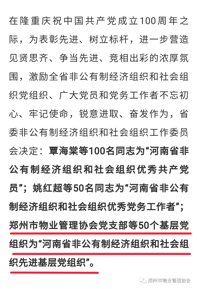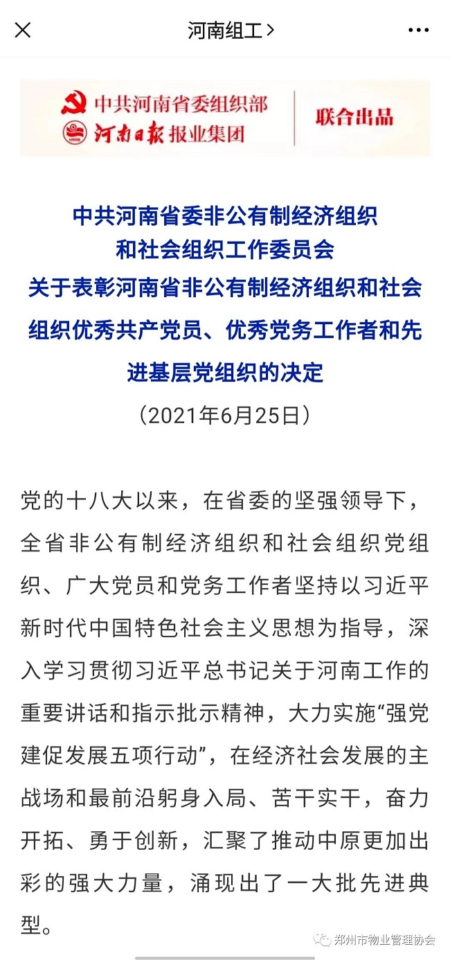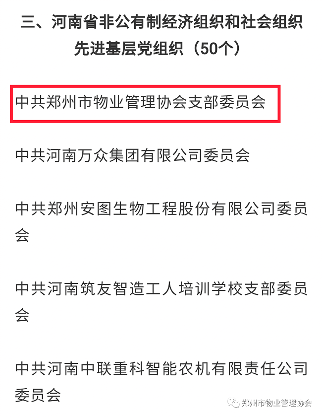 6月25日,中共河南省委非公有制经济组织和社会组织工作委员会表彰一批河南省非公有制经济组织和社会组织优秀共产党员、优秀党务工作者和先进基层党组织,郑州市物业管理协会党支部等50个基层党组织为“河南省非公有制经济组织和社会组织先进基层党组织”。