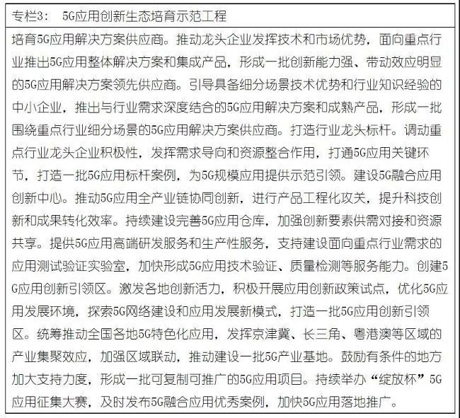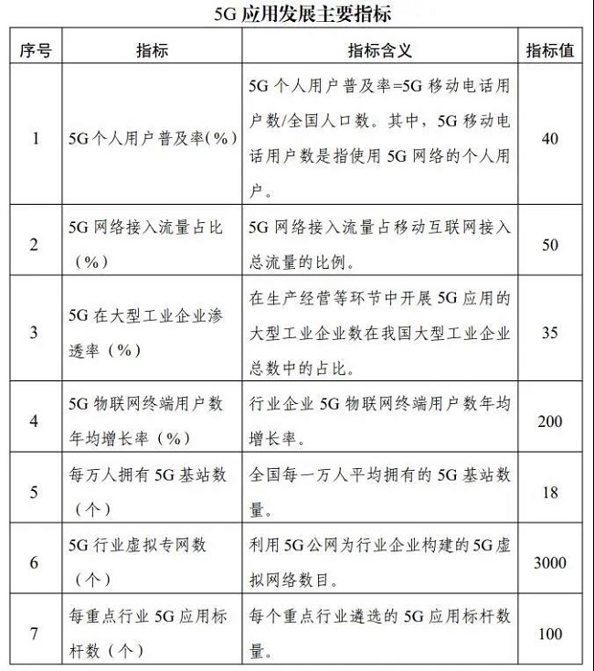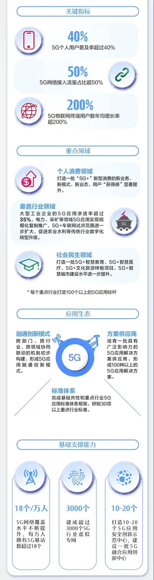 ——重点领域5G应用成效凸显。个人消费领域,打造一批“5G+”新型消费的新业务、新模式、新业态,用户获得感显著提升。垂直行业领域,大型工业企业的5G应用渗透率超过35%,电力、采矿等领域5G应用实现规模化复制推广,5G+车联网试点范围进一步扩大,促进农业水利等传统行业数字化转型升级。社会民生领域,打造一批5G+智慧教育、5G+智慧医疗、5G+文化旅游样板项目,5G+智慧城市建设水平进一步提升。每个重点行业打造100个以上5G应用标杆。