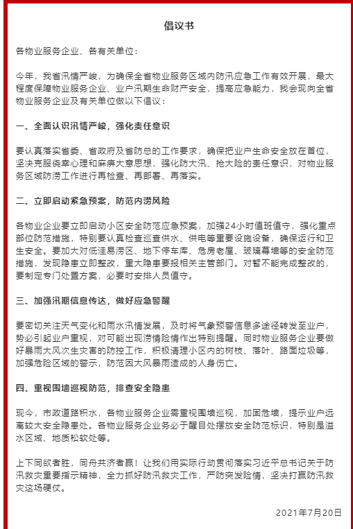 倡议全省物业服务企业及有关单位要全面认识汛情严峻,强化责任意识;立即启动紧急预案,防范内涝风险;加强汛期信息传达,做好应急警醒;重视围墙巡视防范,排查安全隐患。用实际行动贯彻落实习近平总书记关于防汛救灾重要指示精神,全力抓好防汛救灾工作,严防突发险情,坚决打赢防汛救灾这场硬仗。