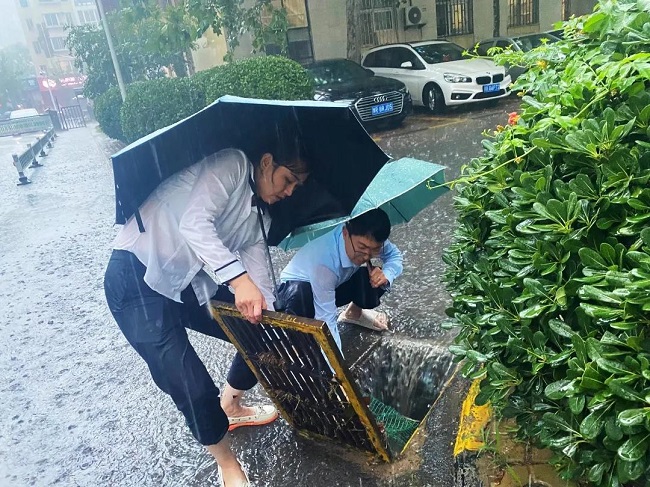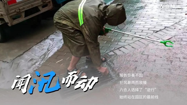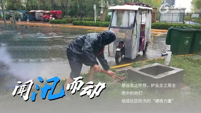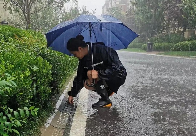 暴雨期间,招商积余各部门分工明确,不顾恶劣天气,奔赴一线,全力开展现场抢险工作。顶着风雨,检查排水口,确保没有杂物堆积,避免管道阻塞造成的积水现状。