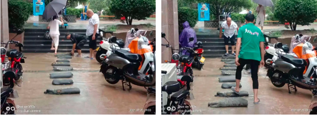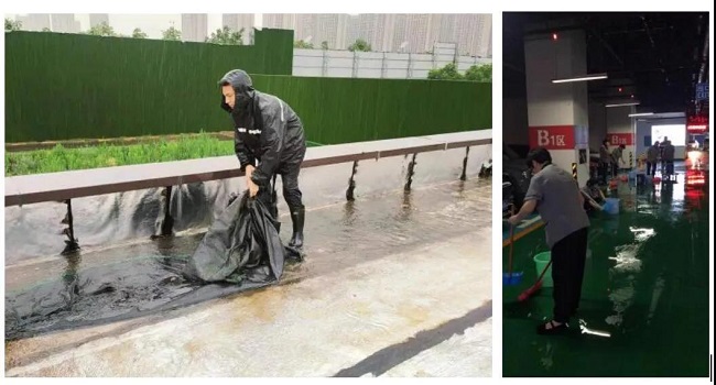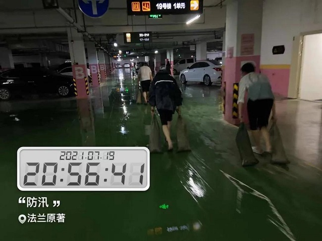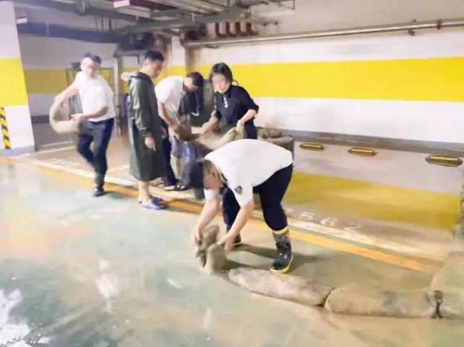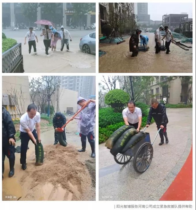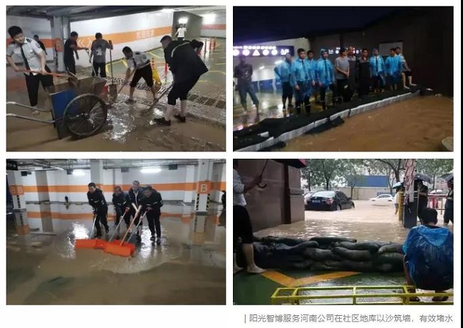 面对暴雨,阳光智博服务河南公司所在社区,党员先行,第一时间成立了紧急防汛救援队,24小时两班倒,在社区出入口为来往行人及归家业主提供帮助,为风雨中的行人提供一个有力的臂膀,给社区最后一公里构筑坚实的后盾。面对暴雨引发的城市大面积积水,阳光智博服务河南公司第一时间为所在社区输送了大量沙袋等防水堵水设施,在洪涝最严重的社区地库筑起沙墙,有效堵水,并迅速以有力排水措施将地库积水向外排出,最大限度避免业主车辆受损。