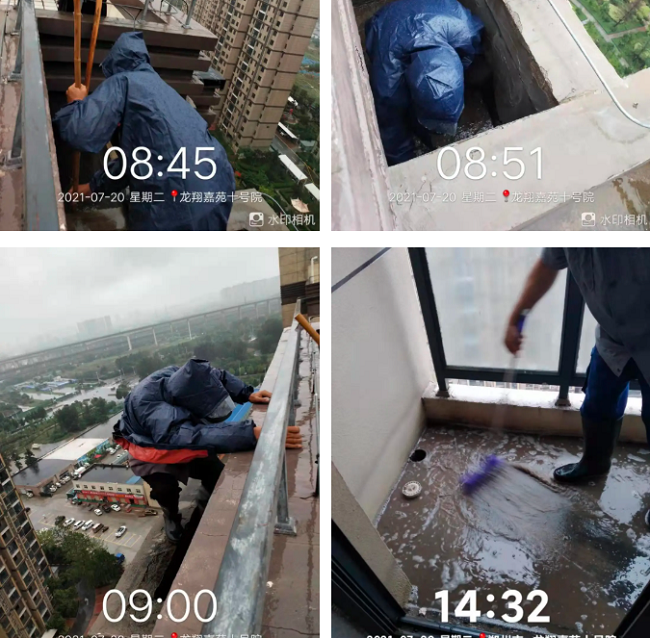 从7月17日,暴雨就开始陆续席卷了河南省内多个地区,彼时大雨过后,建业物业人并未松懈,一边继续巡视、检查、疏通、清理、排水......一边进行安全消杀与清洁,避免在细菌、蚊虫在潮湿的环境中滋生。到了7月20日,暴雨愈发猛烈,建业物业的一线员工毅然冲上最前线展开防汛,顶着巨大的暴雨,对因暴雨而损坏的设施设备进行抢修,补充防汛物资。