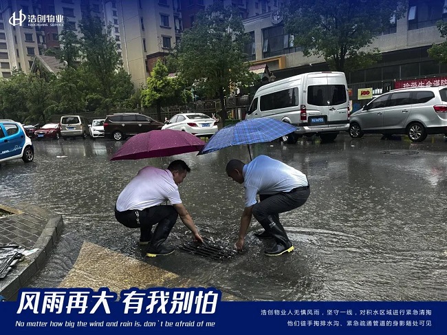 无论风雨多大,浩创物业人始终都在严阵以待,防汛抢险,守护家园平安,为业主保驾护航。具体措施上,浩创物业在夜间巡检检查电梯轿厢、排水沟、下水道等确保园区排水正常进行,并在水量过高时及时启动排污泵进行排污。
