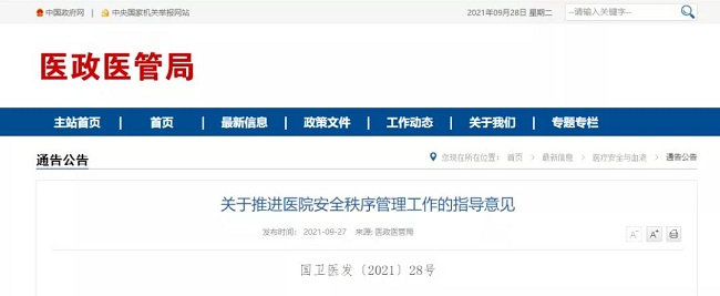 国家卫健委网站消息,日前,国家卫生健康委、中央政法委、中央网信办、最高人民法院、最高人民检察院、公安部、司法部、国家中医药局发布《发布关于推进医院安全秩序管理工作指导意见》。为认真贯彻落实习近平总书记重要指示批示精神,进一步维护正常医疗秩序,保护医务人员人身安全,为医患双方营造良好诊疗环境,就推进医院安全秩序管理工作提出以下指导意见。