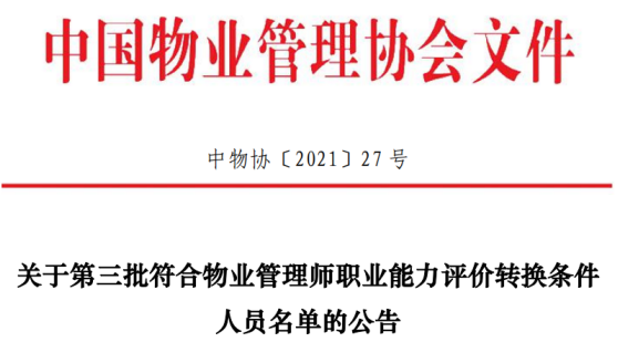 根据《物业管理员(师)职业能力等级评价管理办法(试行)》和《物业管理员(师)职业能力等级评价实施细则》规定,经公示和审核,现将第三批符合物业管理师职业能力评价转换条件人员名单予以公告,准予转换。