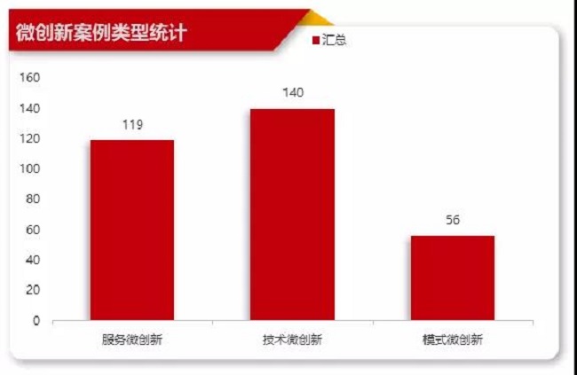 截至目前,收到企业上报的“微创新”案例共计315个,按类型统计:服务微创新119个,技术微创新140个,模式微创新56个(图1)。