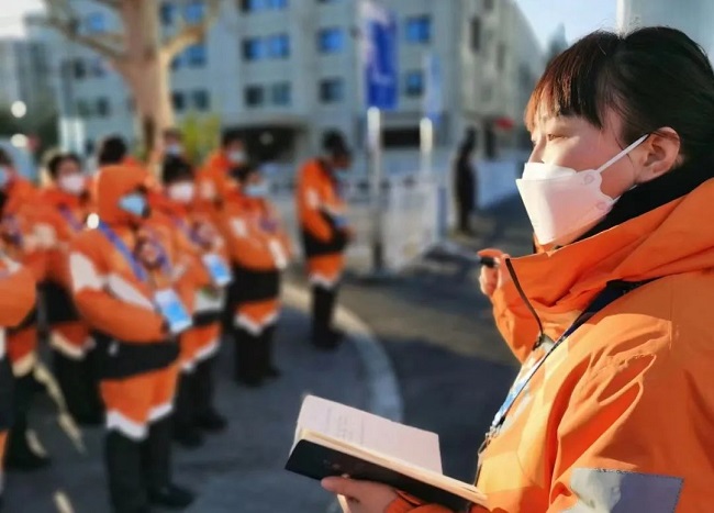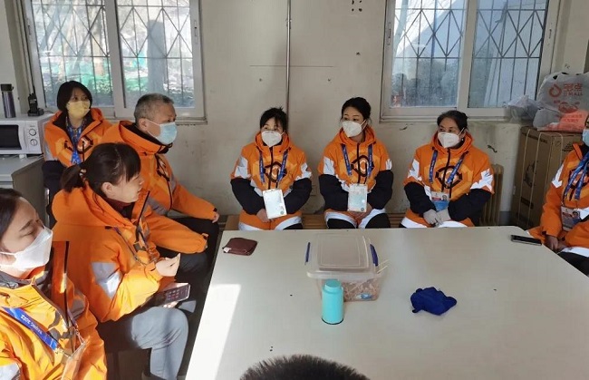 早上6点,是例行的培训时间。由于此次参与冬奥服务保障的人员来自不同的分公司,工作岗位和工种也各有不同。为保障团队协作和服务品质的和谐统一,黄凤新每天都要进行班前培训,一是对前一天的工作进行讲评,二是对出现的问题和亮点进行说明,三是对当天工作的重点和注意事项进行部署。同时,由于大部分员工是外埠人员,在参加冬奥会服务保障期间不能回家过年,再加上疫情和工作压力等因素,思想上容易产生波动和负面情绪,为了减少由此带来的影响,黄凤新还要随时了解现场人员的思想状态,并为大家加油鼓劲。