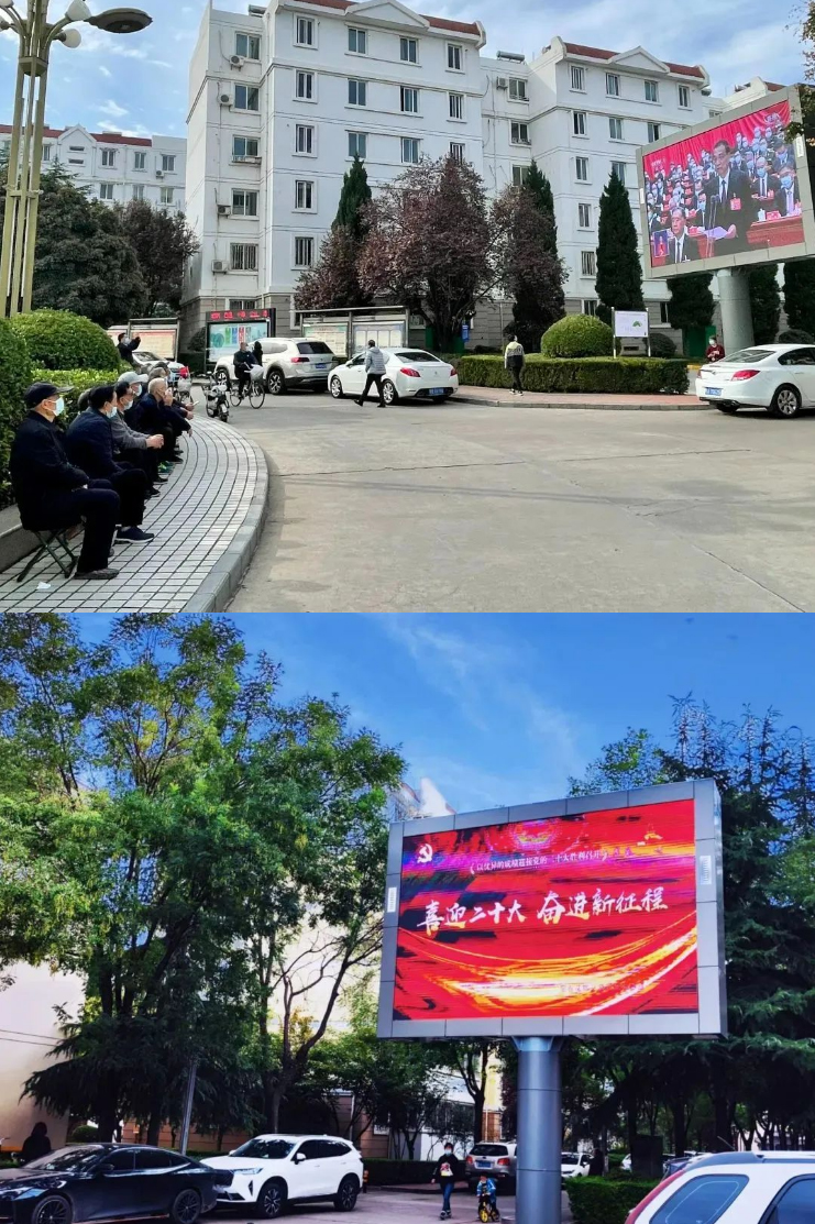 宝石花冬奥文化广场在广场大屏播放大会时况,为小区居民收看党的二十大开幕会盛况提供便利条件。