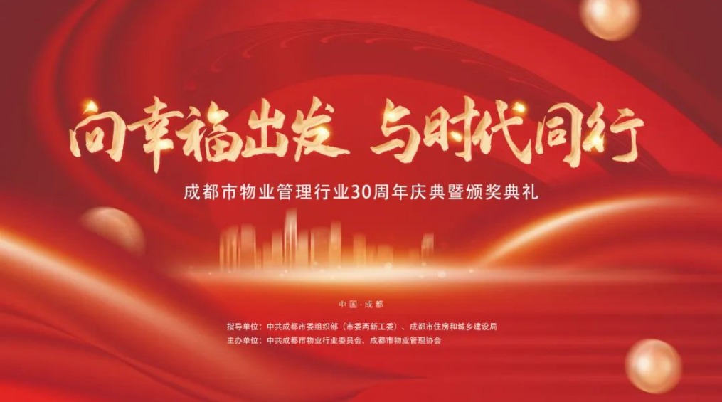 12月26日下午,由中共成都市委组织部(市委两新工委)、成都市住房和城乡建设局指导,中共成都市物业行业委员会、成都市物业管理协会主办的“向幸福出发 与时代同行”成都市物业管理行业30周年庆典暨颁奖典礼在成都盛美利亚酒店隆重举行。省住建厅党组成员、机关党委书记杨搏,市住建局党组书记夏先义,市委两新工委专职副书记余昌洪,市住建局副局长、市物业行业党委书记赵江明,省住建厅房地产市场监管处副处长(主持工作)许云勇,市委组织部组织三处处长罗恒,市住建局一级调研员、市物业行业党委副书记袁庆华,市住建局物管处处长张睿,省住建厅房地产市场监管处一级调研员左定伦,市物业事务中心负责人戴海龙,市住建局办公室副主任唐唯轩,市物业管理协会会长李旭东、名誉会长闻涛、监事长刘旭奔、执行会长巫庆敏等领导出席活动。成都物业行业老一辈专家和企业家,业主代表,各区(市)县物业行业党委代表、协会会员代表,媒体代表以及行业30周年评选出的功勋人物、领军人物、先锋人物、感动人物、新锐人物近200人受邀参加了活动。活动通过协会微信视频号同步直播,逾万名物业从业人员通过线上观看活动盛况。