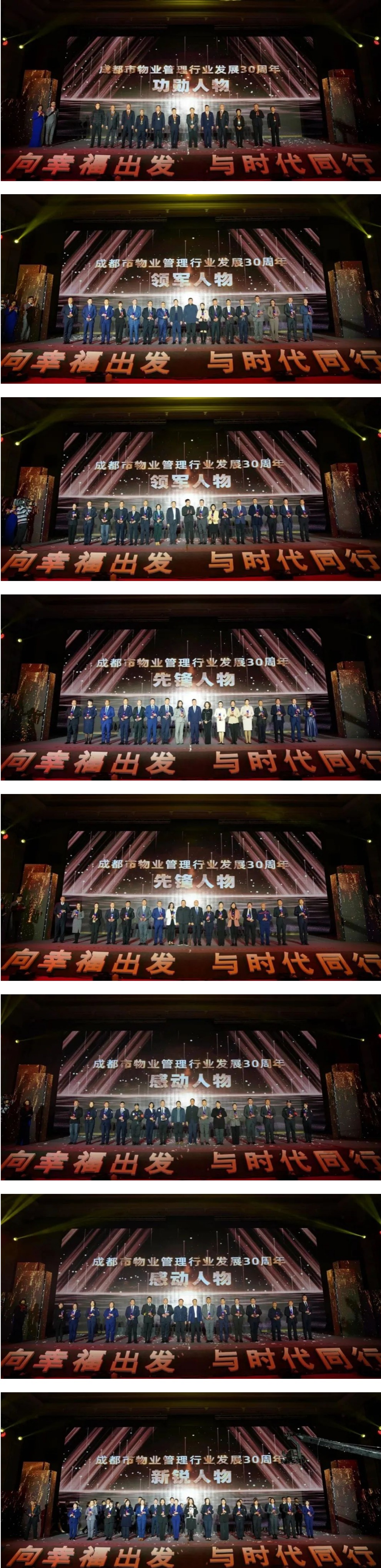 活动现场还进行了盛大隆重的颁奖典礼,132名成都市物业管理行业发展30周年功勋人物、领军人物、先锋人物、感动人物、新锐人物,他们身着盛装、步履铿锵、满怀豪情走过红毯,并依次上台接受荣誉和表彰,接受鲜花和掌声,接受礼赞和致敬。在他们当中,既有为行业发展和协会建设奠定坚实基础、作出卓越贡献的老一辈物业人,也有行业中有才干、有潜力、有坚定的职业价值认同感的青年骨干;既有对行业发展有积极影响和突出贡献的企业家、行业专家人才,也有敬业奉献、助人为乐、见义勇为、诚实守信的模范人物。以他们为代表的成都物业人用行动再次证明,伟大出自平凡,平凡造就伟大。只要有坚定的理想信念、不懈的奋斗精神,脚踏实地把每件平凡的事做好,一切平凡的人都可以获得不平凡的人生,一切平凡的工作都可以创造不平凡的成就。