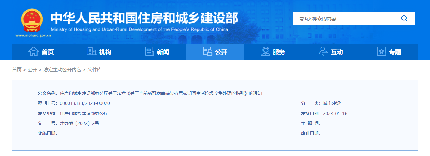 近日,国家疾控局、住房和城乡建设部、生态环境部联合制定了《关于当前新冠病毒感染者居家期间生活垃圾收集处理的指引》(以下简称《指引》)。