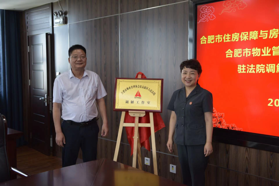 合肥市物业管理协会物业合同纠纷调解中心,积极贯彻落实中共中央办公厅、国务院办公厅《关于完善矛盾纠纷多元化解机制的意见》及《最高人民法院关于建立健全诉讼与非诉讼相衔接的矛盾纠纷解决机制的若干意见》,依据《安徽省多元化解纠纷促进条例》开展诉调对接和行业调解的工作要求,积极探索新的矛盾调解方式。在2020年8月,调解中心驻合肥市蜀山人民法院物业合同纠纷调解工作室正式挂牌成立,调解中心派专职调解员2-5名常驻各驻点法院调解工作室,法院无偿支持各调解室办公设施和场地。