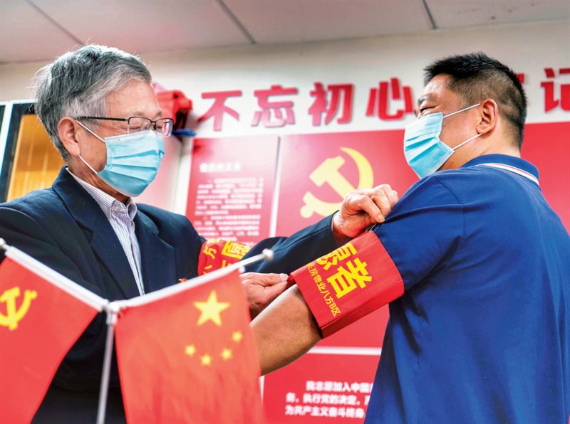 在长沙市八方社区B区党支部邻里服务中心,小区党支部书记谌凯丰为长房物业项目经理刘学理戴上光荣的志愿者袖章。小区志愿队成员囊括物业服务中心全体人员、小区党员等,是连接物业、社区和业主的桥梁,在基层共治、议事协商、抗疫工作中都有亮眼的表现。