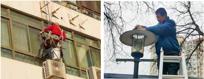 物业在进行外墙清洗和路灯维护
