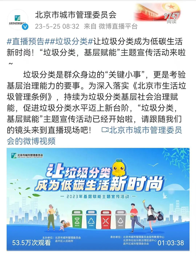 正值首届全国城市生活垃圾分类宣传周,5月25日,北京市城市管理委员会联合昌平区人民政府,在昌平区北店嘉园社区设立主会场,通过网络视频面向全市举办“让垃圾分类成为低碳生活新时尚”2023年基层赋能主题宣传活动。