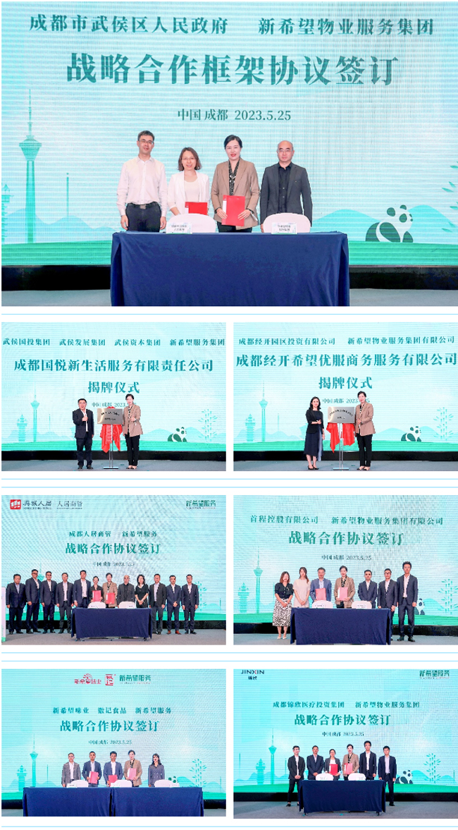 恰逢上市2周年,新希望服务也在论坛期间与成都市武侯区人民政府、成都人居商业管理有限公司、首程控股有限公司、四川新希望味业有限公司、四川徽记电子商务有限公司、成都锦欣医疗投资集团有限公司6家单位,分别签署了战略合作协议。同时,与武侯国投、武侯发展、武侯资本联合成立合资公司,与成都经开园区投资有限公司成立合资公司。