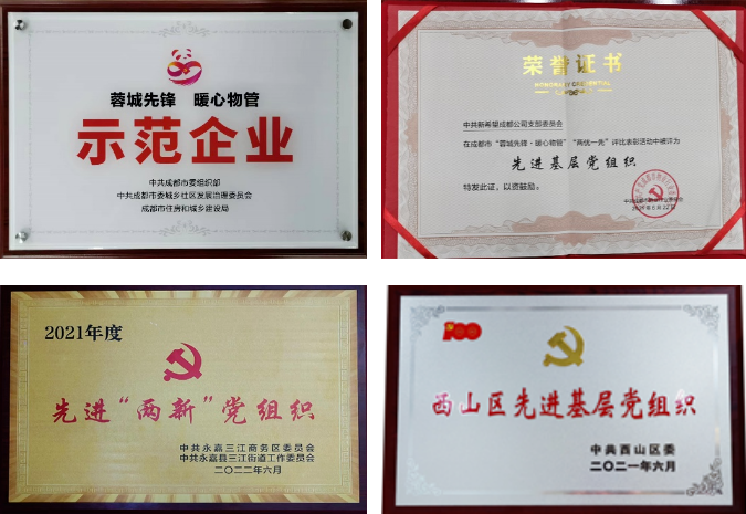从组织到人,从人到组织,新希望服务在党建引领下,其红色物业工作也屡获认可,多次获得“四川优秀红色物业、辽宁省党建引领物业服务先进企业、成都市先进基层党组织、南宁市物业管理行业先进基层党组织”等称号,其中温州揽江阁项目获浙江省2022年度省级红色物业项目,塔子山壹号入选“四川省百佳示范小区”,皇冠湖壹号、锦悦楠庭等获成都市“蓉城先锋·暖心物管”党建示范项目,也曾获得新华社「党旗在基层一线高高飘扬」的专题报道。