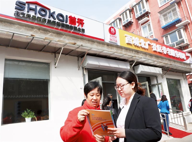 首开天岳恒公司联合属地街道和社区共同开启养老服务驿站,为社区居民提供多样化居家养老服务。图为养老驿站工作人员为居民介绍服务项目。