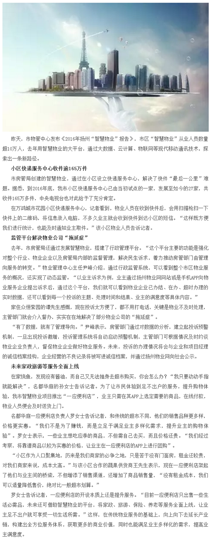扬州市区超10万人从事“智慧物业” 未来家政养老等服务将全面上线