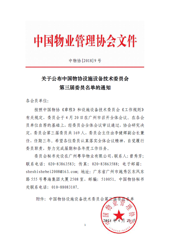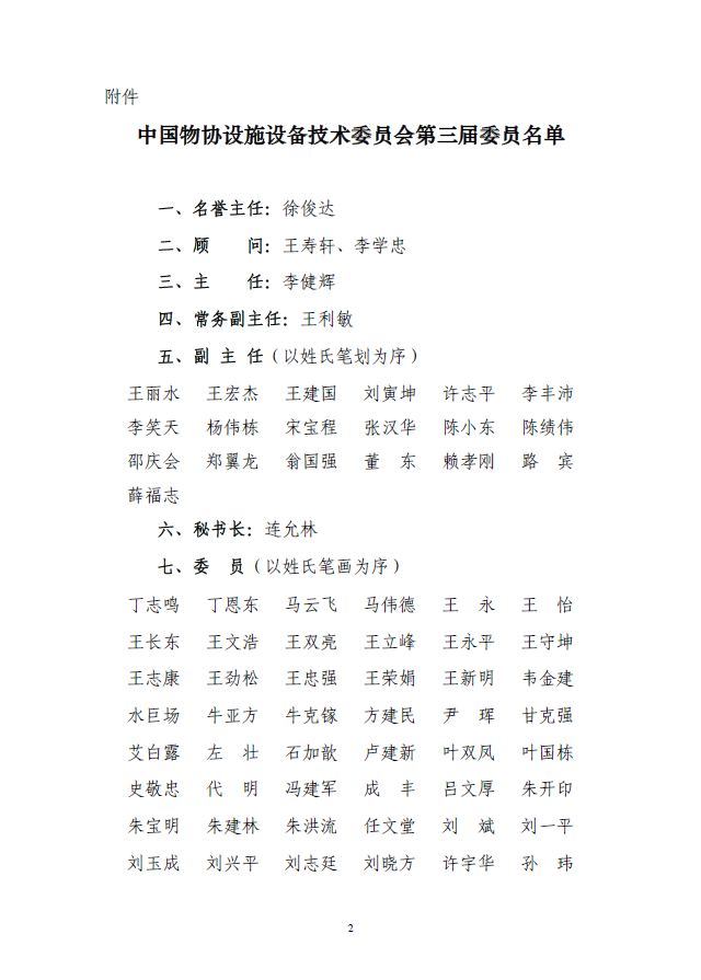 关于公布中国物协设施设备技术委员会第三届委员名单的通知