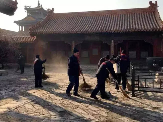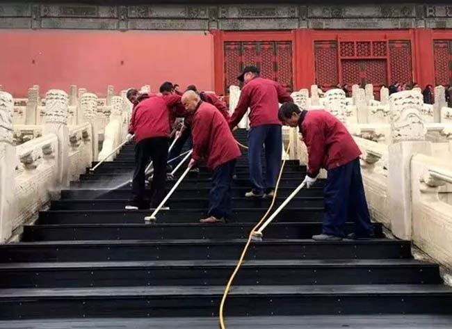 物业人坚持最高标准、最严要求来做好故宫的保洁清洁服务工作,每一条砖缝、每一个角落都不放过,用他们的话说,“必须像洗脸一样做好故宫的保洁:故宫不仅仅是历史和文化的载体,更是首都北京的一张名片,不能让这张名片蒙尘……”。