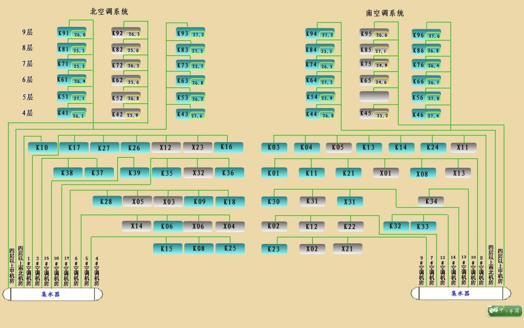 二、运行效率低。东环广场有南北两个制冷机房和87台集中式空调机组。改造前,南北各有1个运行班组,负责空调冷热源和末端空调机组的运行。因为设备众多,运行人员在本地按顺序对整个空调系统完成开关机就需要4个小时,这种状况造成的后果是运行人员工作量大和空调机组无效运行时间较长,从而降低了空调的运行效率。下图能清晰地看到南北两个空调系统的分布情况。