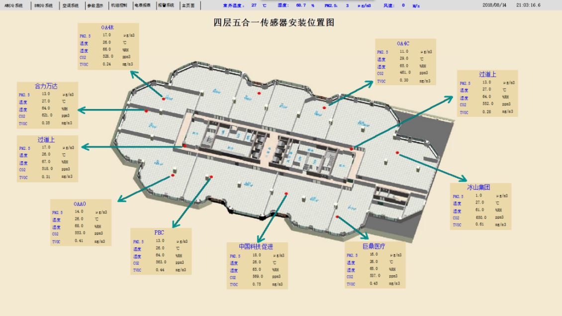 第三阶段是整个智能化的重点,是在前两步改造的基础上,通过在客户区域安装五合一空气质量检测仪,在户外安装气象站,对软件进行编程,使室内空气参数对末端空调机组和冷热源相关联,自动调节末端空调机组和制冷机组。具体有以下功能:(1)对制冷(制热)设备机组运行采取群控方式,并根据系统负荷的变化合理调配机组运行台数;(2)制冷机组的出水温度根据室外气象参数和除湿负荷的变化进行设定;(3)空调系统的开关机时间根据室外气象参数和室内空气参数进行设定。通过这一阶段的改造,最终实现空调系统的智能化运行。下图是五合一空气质量检测仪的平面分布图: