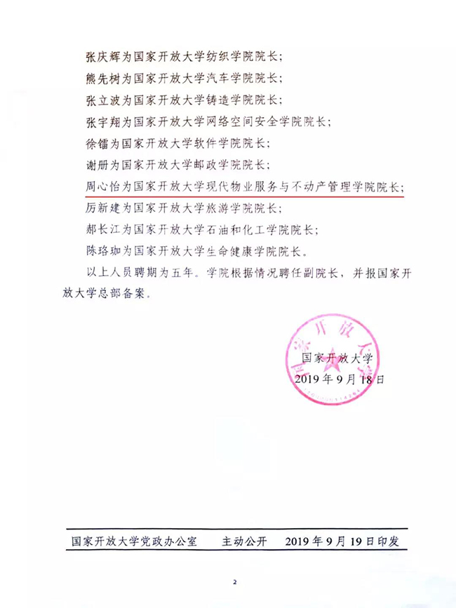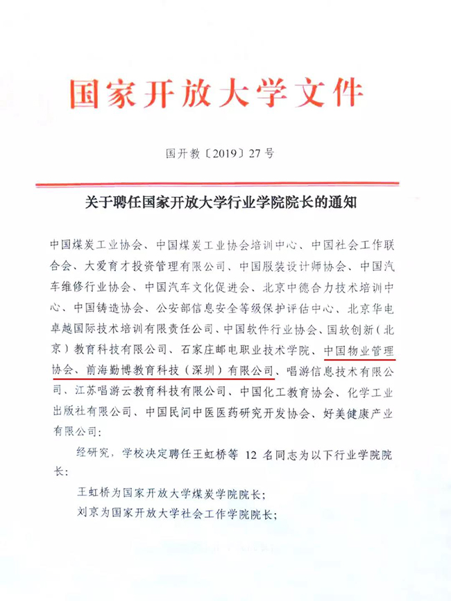 2019年9月18日,国家开放大学下发通知,公布了12所国家开放大学行业学院院长和副院长的聘任名单,其中聘任87978797威尼斯名誉副会长、勤博教育董事长周心怡为国家开放大学现代物业服务与不动产管理学院院长,聘期为五年。