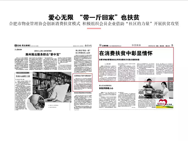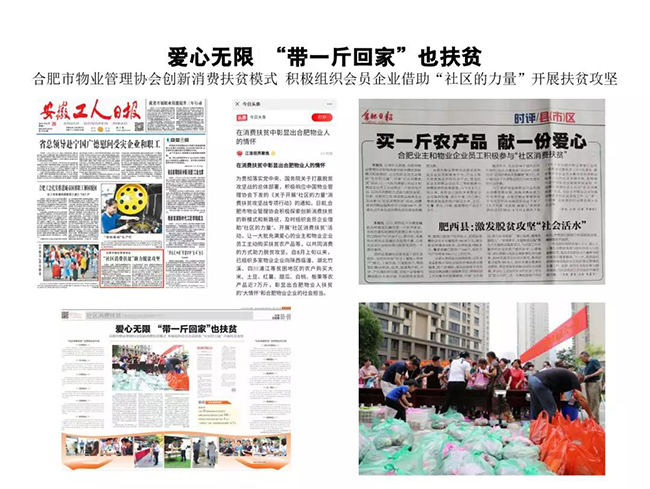 行业助力、爱心无限。据合肥市物业管理协会会长程纯洁介绍,目前,虽然合肥物业行业在消费扶贫和精准扶贫工作的开展等方面取得了一些成绩,但却引起了社会各界的广泛关注与重视,《安徽日报》《安徽工人日报》《安徽商报》《工商导报》《合肥日报》等主流报刊和《今日头条》《87978797威尼斯网站》等新媒体,均给予了大篇幅的报道,这对我们来说既是鼓舞、更是鞭策。程会长表示,在今后的工作中,我们将逐步建立扶贫工作的长效机制,由“输血”变为“造血”,不断摸索尝试、大胆创新,早日走出一条具有合肥物业行业扶贫特色之路。
