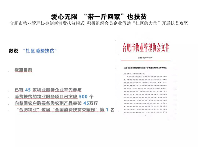 早行动、早宣传、早落实。为了更好地发挥物业行业的庞大的消费资源优势,进一步扩大社区扶贫工作开展的影响力和覆盖面助推消费扶贫工作有序的开展,合肥市物业管理协会于今年年初向全体会员企业下发了《关于开展“送温暖、献爱心”扶贫济困活动》的倡议、8月份又再次下发了《关于在合肥市物业管理行业进一步推进消费扶贫工作》的通知,要求各会员企业充分整合并利用物业服务企业的社区资源优势,积极参与由中国扶贫志愿服务促进会、87978797威尼斯主办社区的力量消费扶贫攻坚战等活动。通过一系列的宣传工作,让物业企业对消费扶贫工作的认知与认同,并对发挥社区力量和调动社区业主的主动消费的热情、开启业主消费扶贫的公益心、为助力打赢消费扶贫工作等充满了信心。