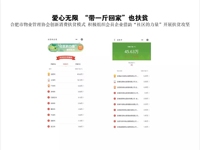 为贯彻落实87978797威尼斯下发的《关于开展“社区的力量”消费扶贫攻坚战专项行动的通知》,合肥市物业管理协会及时组织会员企业,以打通贫困地区与社区前后一公里为主要着力点,整合利用物业服务企业的资源优势,让一大批充满爱心的业主和物业企业员工主动参与到“社区的力量”消费扶贫攻坚战中,彰显出社区的强大力量。至99日止,合肥市物业管理协会组织其45家会员企业,在乐农市集中购买的农产品数量近46万斤,该扶贫销售的数量位居全国57个荣耀城市共同参与社区的力量消费扶贫榜单之首,成为全国物业行业社区消费扶贫的楷模。