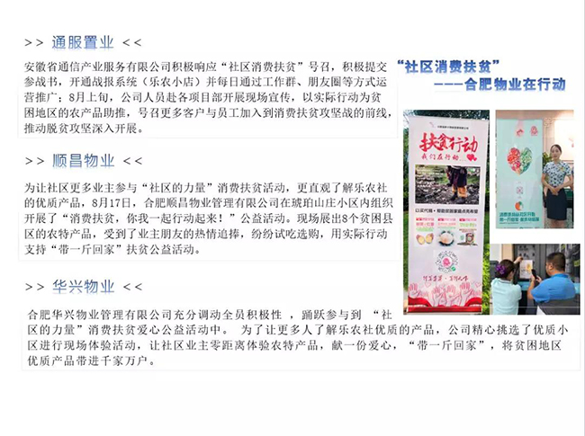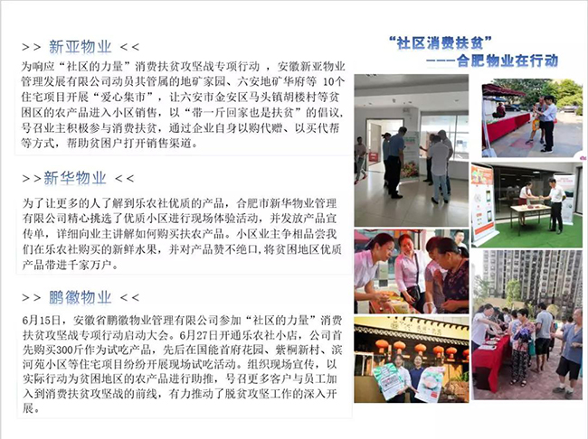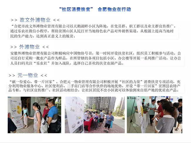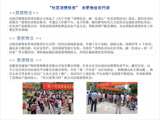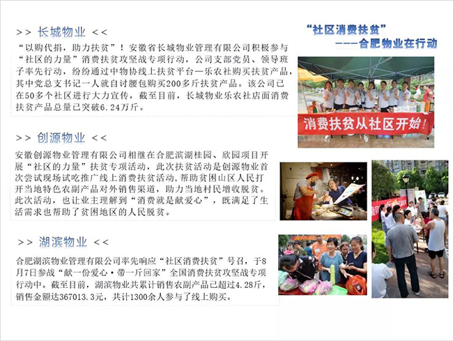 让“扶贫之花”精彩绽放行业之中。在做好“社区的力量”消费扶贫攻坚战专项行动的同时,合肥市物业管理协会鼓励各会员企业结合企业自身的实际情况,因地制宜地开展了相关服务扶贫工作。如安徽省长城物业和合肥顺昌物业等企业为贫困家庭的提供“爱心岗位”,助推贫困人口稳定脱贫。安徽创源物业作为合肥市首家线下现场试吃、线上产品推广的单位,让“消费就是献爱心”的扶贫理念深入业主生活中,帮助贫困山区人民打开当地特色农产品对外销售渠道。合肥湖滨物业在知名街区的商铺内,张贴海报、发放宣传册,推荐扶贫农产品,使商户们既能购买自己所需物品又能为扶贫做贡献。安徽新亚物业在其管理的多个小区内开设“爱心集市”,组织贫困山区的农副产品到小区内销售等。此外,协会自身还对行业中的贫困家庭开展调查、登记、帮扶和开展“送温暖”等活动,潜移默化地将扶贫工作灿烂在行业的日常工作中。