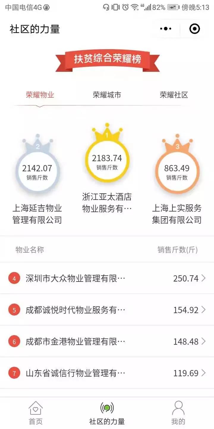 火热7月,比天气更火爆的是“社区的力量”大型扶贫公益活动。距离6月15日,在国务院扶贫办举行的“社区的力量”消费扶贫攻坚战誓师大会已过去一个月。在这段时间里,全国已经有近150个物业企业加入社区的力量战报系统,近1000个社区开通社区的力量助农小店!同时,产生了全国首个周冠军——浙江亚太酒店物业服务有限公司,连续稳居“社区的力量”实时战报系统全国第一名!截止7月12日下午17时,亚太酒店物业累计线上销售扶贫产品2183.74斤,位居扶贫战区综合排行榜物业企业第一位。