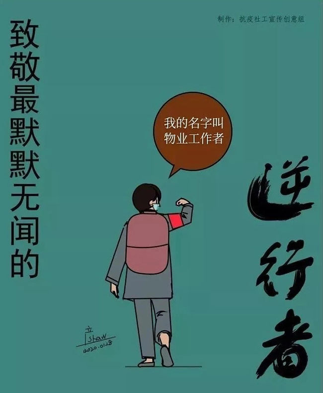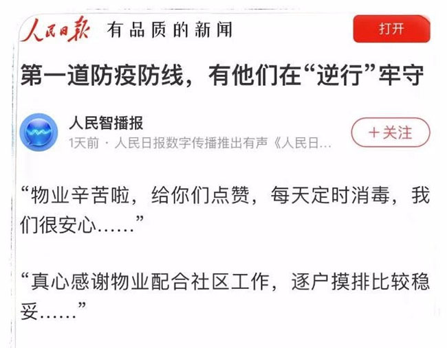 作为在这场疫情阻击战中在第一线的物业行业全体从业人员用他们的实际行动,感动了广大业主,感动了社会各界,物业行业和各地方相关媒体乃至央视媒体也争相报道。例如:202023日《人民日报》点赞物业人:第一道防疫防线,有他们在逆行牢守,202028日,沈建忠会长在微信群内转发了央视新闻对物业服务企业视频报道。物业人在这场战斗中,被业主亲切地称为保护神,最美的"逆行者",这句称呼让我们行业千万人感动,它是全国一千万物业大军无私无畏奉献自我后得到的认同与赞美。