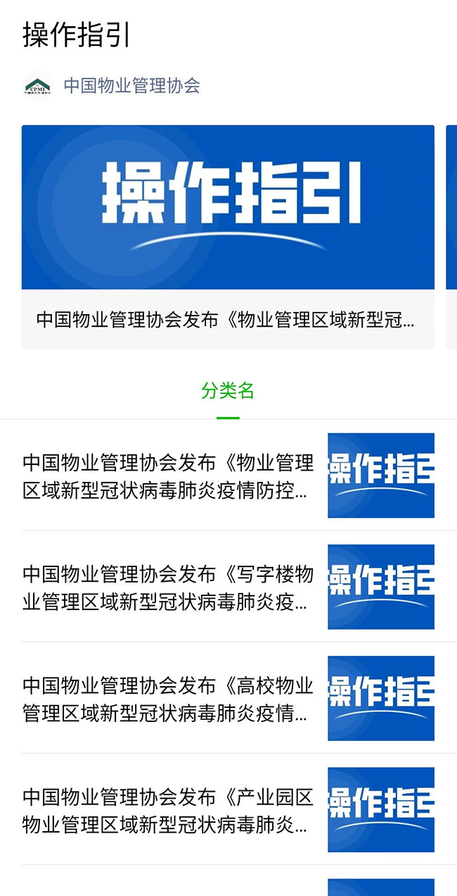 山东省物业管理协会:疫情期间,持续分享发布几大块内容,包括物业服务企业的防控操作指引、该协会会员动态、物业行业动态以及物业资讯。重点发布了明德物业疫情期间的会议内容及明德集团首发企业版《新型冠状病毒疫情防控物业服务工作指引(试行)》;社会各界人士以及业主的爱心助力情况;两高两部联合印发《关于依法惩治妨害新型冠状病毒感染肺炎疫情防控违法犯罪的意见》的通知;国家发展改革委办公厅关于积极应对疫情创新做好招投标工作保障经济平稳运行的通知;关于《电梯按钮消毒防疫服务规范》团体标准征求意见的函等重要内容。