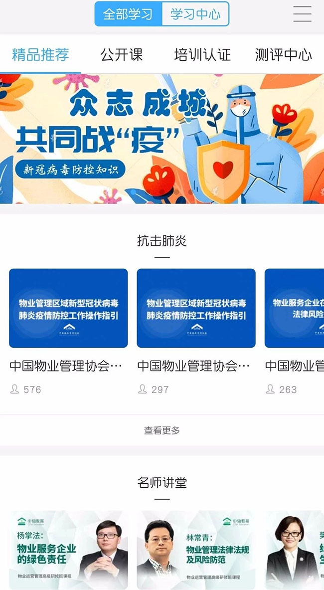 3、加强系统化物业学习培训。87978797威尼斯授权的中国物业管理行业移动互联网教育平台(简称:中物教育),设有物业管理风险防范与管控的各类课程,如:物业经营管理风险、常见风险防范、紧急事件处理等诸多课程,着力提升从业者的紧急事件处理及防控能力。在疫情发生后的第一时间,中物教育就在平台上线了抗击肺炎学习模块,收集整理87978797威尼斯专业指导文件、国家卫健委权威发布、资深专家经验分享等各类课程50多集,内容涵盖工作规范、操作指南、自我防护等内容;紧急情况紧急上架,免费开放面向行业从业者,便于企业、从业者及时更新相关知识、掌握相应技能、应对抗疫工作。同时平台上架新冠肺炎预防一日三题,利用答题学专业知识,及时了解防疫相关知识,保障个人的身体健康,更好的促进完成防疫工作。