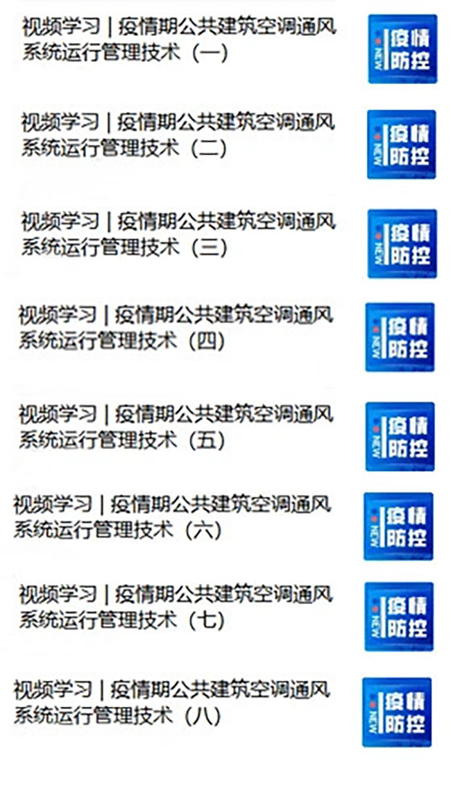 ▲行业学院制作的8期16集《疫情期公共建筑空调通风系统运行管理技术》。