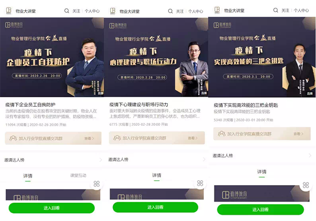 2月28日至3月1日,《疫情下心理建设与职场行动力》《疫情下实现高效能的三把金钥匙》也相继开播,来自福晟生活服务、深圳建发物业,深圳吉祥服务集团、深圳建业物业、前海人寿物业、嘉兴港区物业、天津创想物业、安徽华服物业、新疆新天物业、黑龙江万瑞物业等近百家企业组织员工全程观看或回放直播进行集体学习,三期直播观看和回放流量累计近4万人次。