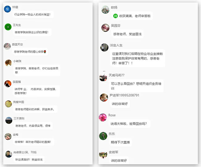 在疫情肆虐的时刻,物业人肩负着一种特殊的使命。有幸观看了行业学院组织的线上防疫系列公益直播,从精心准备的内容、精彩讲课的老师及特殊设置的环节等,体验到学院老师们的智慧和良苦用心,不愧为行业教育的先锋,这个时刻我们更需要抱团加油打气。期待行业学院组织更多形式的培训,拓宽视野、开放多元,带领同行不断的充实自己、快速成长。