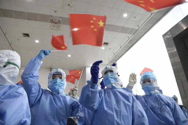 3月9日,郑州大学第一附属医院援鄂抗疫医疗队队员走出江汉方舱医院。