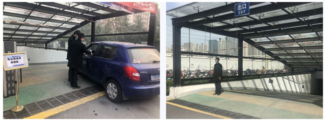1.安排工作人员在停车场进口对下地下室的车辆扫码测温,在停车出口安排人员防控;