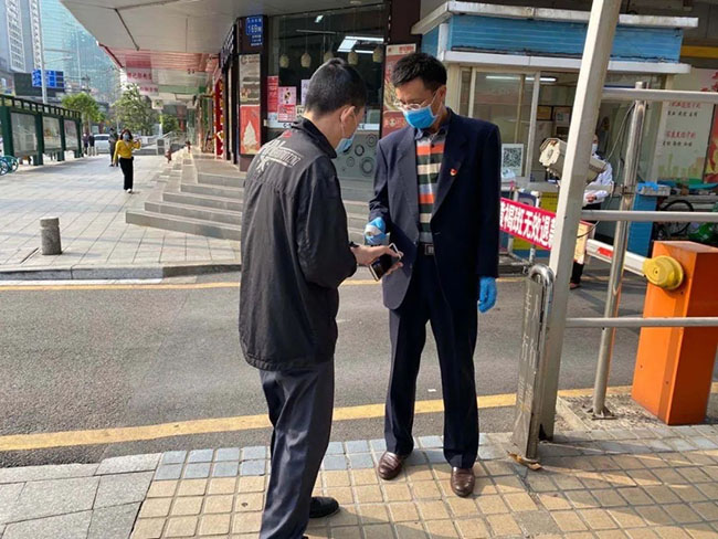 “关键时刻党员要冲锋在前。”支部党员蒋宗传说,“我们的保安员就是社区疫情防控的第一道防线。他们每天不仅要对来访人员进行测温和登记,还要协助开展物业管理费收缴、卫生清洁消毒、日常物业服务、疫情防控情况排查等工作,非常忙碌,我们真想帮帮忙。”