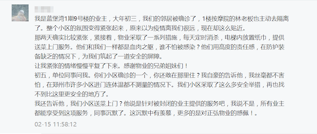 那两天确实比较紧张,紧接着,物业采取了一系列措施,每天定时消杀,电梯内放置纸巾,提供送菜上门服务。他们和我们一样都是血肉之躯,谁不怕被感染?他们用高度的责任感,在防护装备缺乏的情况下,为我们筑起了一道安全的屏障。